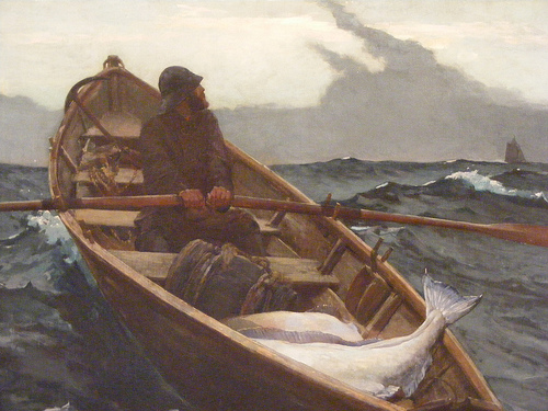 And left them labouring on his landward way.